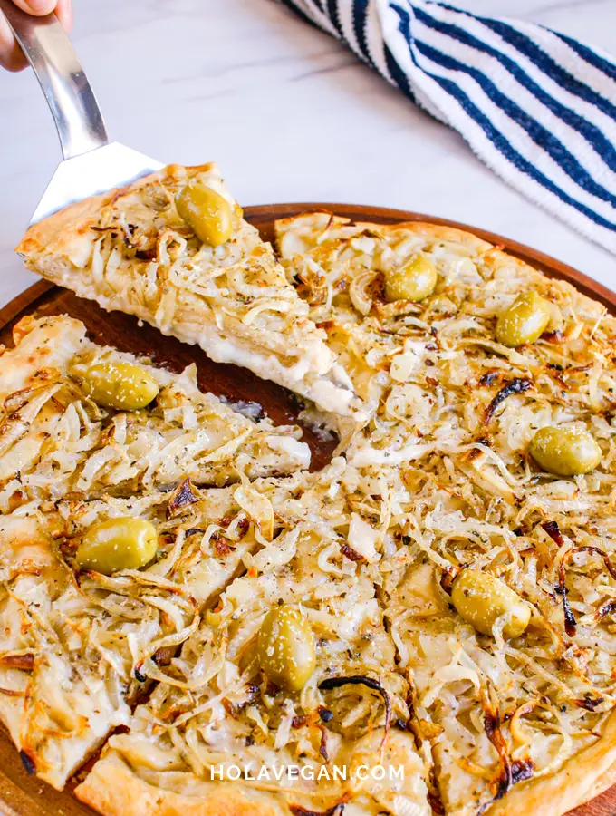 Cebolla caramelizada, queso mozzarella, orégano y oliva.